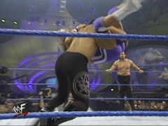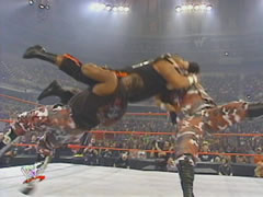The Dudley Boyz (Buh-Buh Ray & D-Von) finish off Tazz with their "3D" finisher.