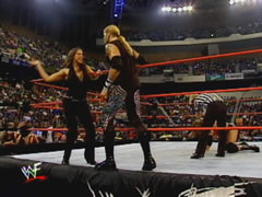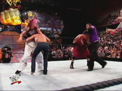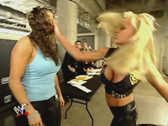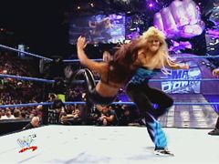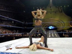 Torrie charged from the turnbuckles and clotheslined Ivory. Talk about striking back. |